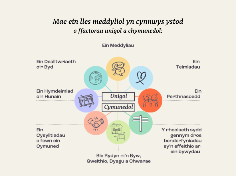 Mae llesiant cymunedol yn ymwneud â’r hyn y mae pobl yn ei wneud gyda’i gilydd a sut maen nhw’n trin ei gilydd. Mae bod yn rhan o fywyd cyfunol a chael cyfleoedd i gysylltu ag eraill yn dylanwadu ar sut rydym yn teimlo am leoedd a mannau, yn meithrin ymddiriedaeth, ymdeimlad o undod a pherthyn. Mae’r pethau hyn yn hanfodol i lesiant meddyliol a gallant liniaru effaith penderfynyddion economaidd-gymdeithasol ehangach o fewn cymunedau. Mae meithrin cysylltiad ag eraill a’r byd o’n cwmpas yn sail i weithredu o blaid yr amgylchedd, wrth i ni addasu i hinsawdd sy’n newid.