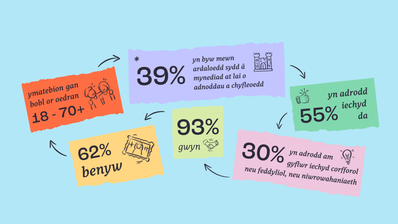 Rydym yn gweithio gyda’r Canolfan Ymchwil ar gyfer Iechyd, Gweithgarwch a Lles (CYIGLL), rhan o Brifysgol Metropolitan Caerdydd i wrando ar oedolion ledled Cymru.